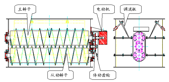 均勻分布煤流的關(guān)鍵零部件是一個(gè)帶不同旋向絞籠的主轉(zhuǎn)子,不同旋向的絞籠從主轉(zhuǎn)子的中心線向主轉(zhuǎn)子的兩頭延伸,在設(shè)備的旋轉(zhuǎn)過(guò)程中使集中落到主轉(zhuǎn)子中部的煤流隨著絞籠均勻分布到整個(gè)主轉(zhuǎn)子方向,達(dá)到均勻布料的效果。