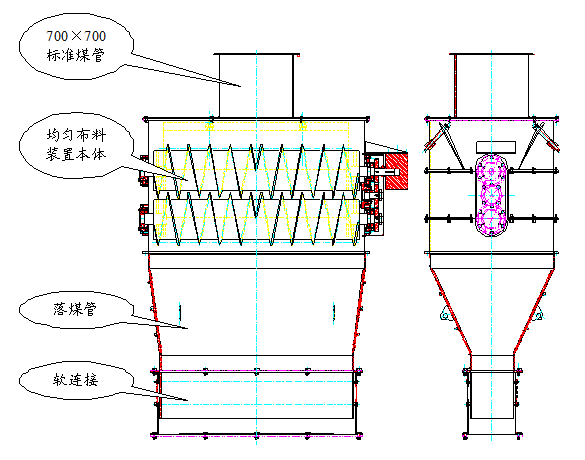 在布料裝置的實(shí)際使用當(dāng)中,我們發(fā)現(xiàn)在設(shè)備的使用當(dāng)中存在這嚴(yán)重堵煤的現(xiàn)象,大量的煤粘結(jié)在主轉(zhuǎn)子上埋沒(méi)絞籠,使整個(gè)轉(zhuǎn)子變成一根毫無(wú)作用的圓筒,無(wú)法均勻布料,于是我們?cè)诖私?jīng)驗(yàn)基礎(chǔ)上進(jìn)行優(yōu)化設(shè)計(jì),在原設(shè)備上加裝了一根從動(dòng)轉(zhuǎn)子,使從動(dòng)轉(zhuǎn)子與主轉(zhuǎn)子同步運(yùn)行,同時(shí)從動(dòng)轉(zhuǎn)子的絞籠插到主轉(zhuǎn)子絞籠內(nèi),在轉(zhuǎn)動(dòng)的過(guò)程中,利用從動(dòng)轉(zhuǎn)子的絞籠將粘結(jié)在主轉(zhuǎn)子絞籠內(nèi)的煤除掉,達(dá)到了防止布料裝置堵煤的特殊效果。
