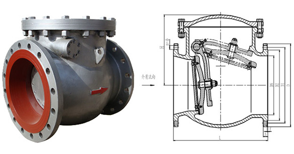 閥瓣在閥體內(nèi)腔處于自然下垂?fàn)顟B(tài),當(dāng)開(kāi)泵正常運(yùn)行時(shí),管路內(nèi)的壓力將閥瓣推動(dòng)沿閥桿軸線轉(zhuǎn)動(dòng)而開(kāi)啟,介質(zhì)通過(guò);停泵時(shí),閥瓣以自身重力和介質(zhì)回流的壓力而自動(dòng)關(guān)閉實(shí)現(xiàn)止回。